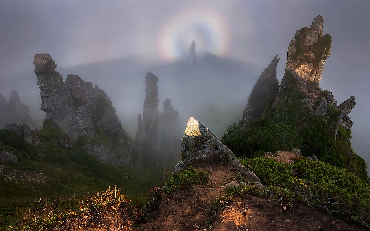 Widmo Brockenowskie to jedno z najsłynniejszych zjawisk optycznych w atmosferze. Powstaje, gdy człowiek stoi na szczycie góry lub na krawędzi warstwy chmur, a Słońce świeci mu w plecy. Jego cień rzutowany jest na mgłę lub chmury przed nim, wyglądając jak gigantyczna postać otoczona tęczową poświatą — glorią, informuje portal Auraposter.pl.